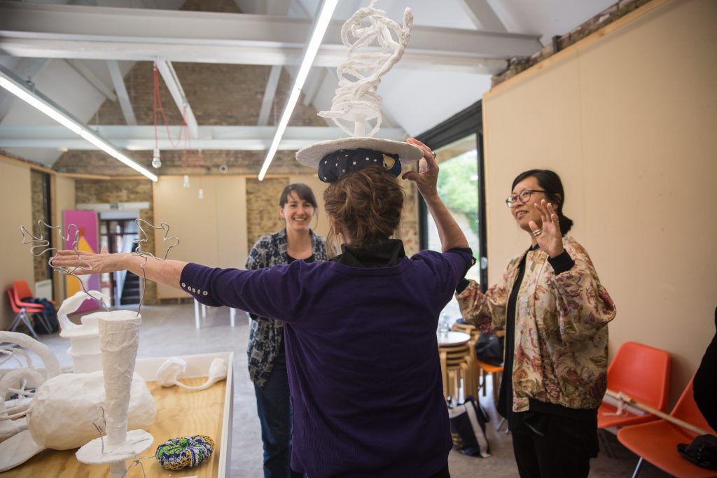 A group of residents living and working around Milton Keynes were invited to a series of workshops to recollect and share their special memories of places which involved collaborative poetry writing, field drawing and performance practice. As a result, participants sculpted objects that embody the emotional values of the memory. As a way of reconnecting the human body with the objects of memory and place, they performed ‘psycho-geographic living sculptures’ by balancing them atop their heads.