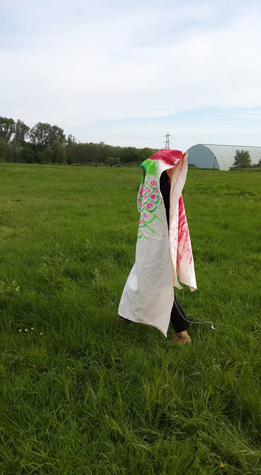Ritual costumes made by land spirits: As a member of makers’ collective RARA, I have been organising a series of public workshops that are theoretically informed and involve making and social actions. Land Rites is one of these workshops. It is to remind the emotional values and social meanings of land. Exploring the land not as an object that can be monetised and abused for profits but as a subject of spiritual power and political voices, the workshop engaged the land with personal memories and spiritual exchange to overcome its reduced value as a ‘property’. Gathering around Hackney Marsh East London, workshop participants were encouraged to communicate with the land and to produce ritualistic costumes based on that interaction. The images shown here is one of mine. The experience of watching the land, absorbing its sound and smells blankly, drawing my reflection on a big piece of fabric, wearing it on and wondering around in disguise was meditational yet sensuous one that I would like to explore further.