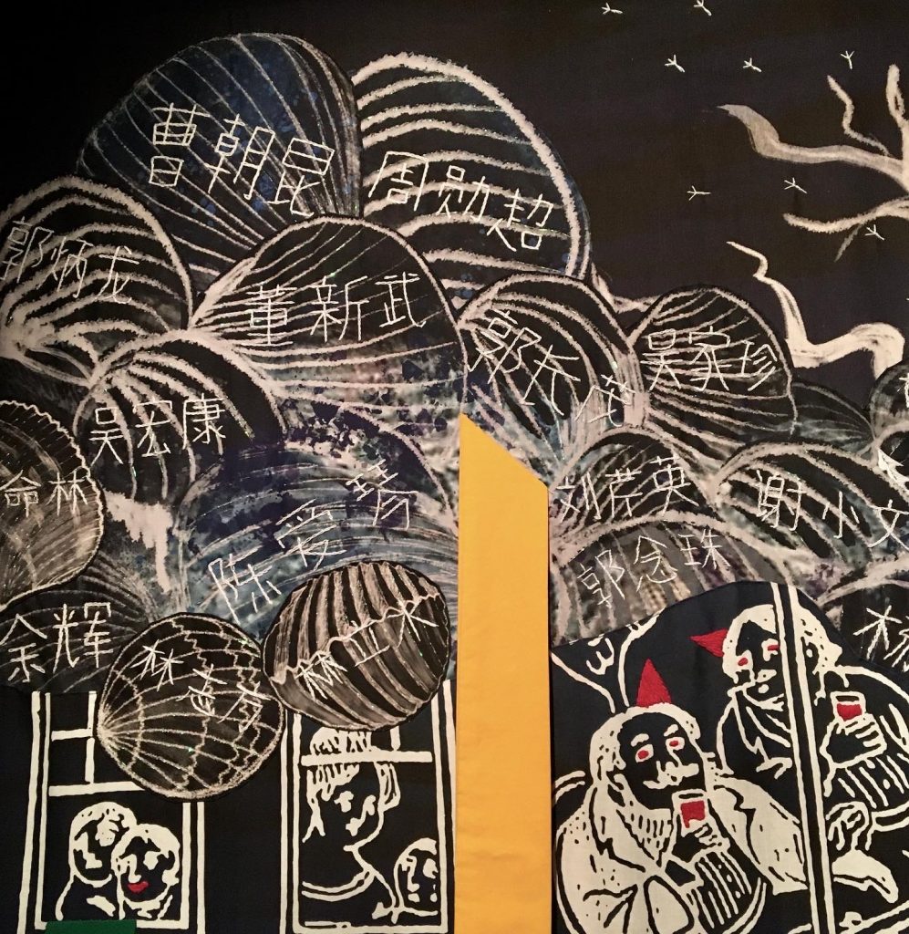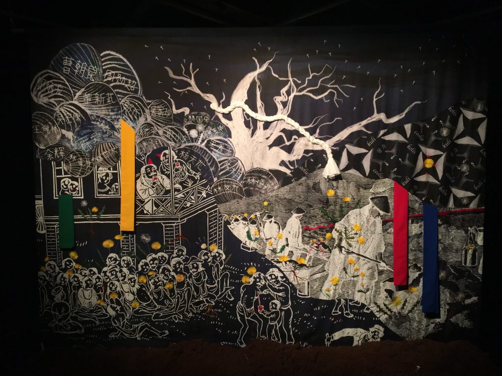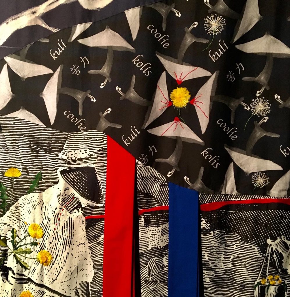 Fermented Flower presents a textile and audio installation, installed in a soil bed along with a dandelion liquor. The woven tapestry composites images drawn from archival research, with reference to the painful history of Chinese indentured labour, as part of a longer perspective on black slavery systems and the ongoing exploitation of migrant workers. The core narrative of weaving is based on one particular Korean shamanistic tradition that utilises flora to draw in, and then expel, the spirit of madness and resentment which arises from suffering. This is detailed in the appliqué of cockles in reference to the Morecambe Bay cockling disaster of 2004, alongside the names of the Chinese victims, and the hand-embroidered healing motifs of dandelion and the holmskioldia plant, reclaimed from its colloquial racist name – Coolie Cap.