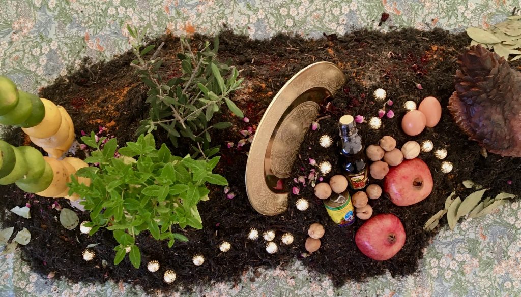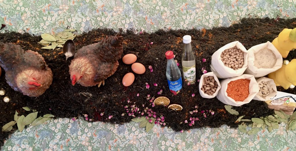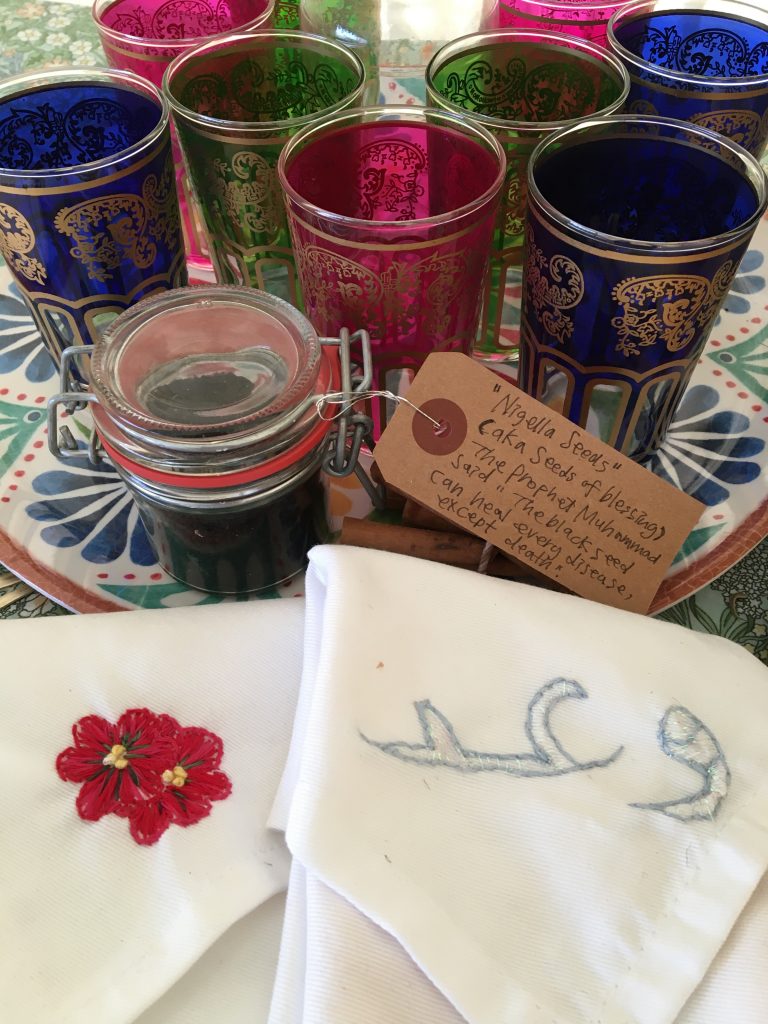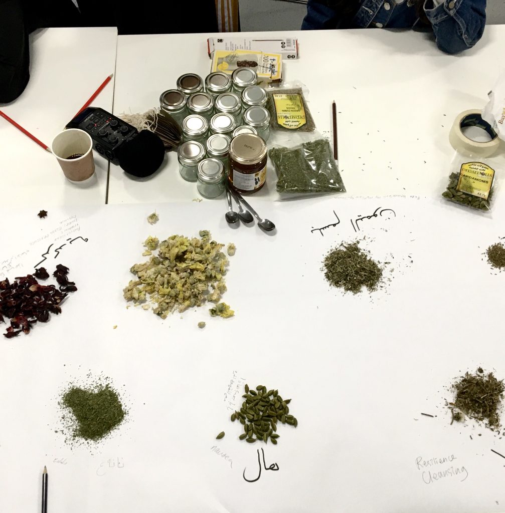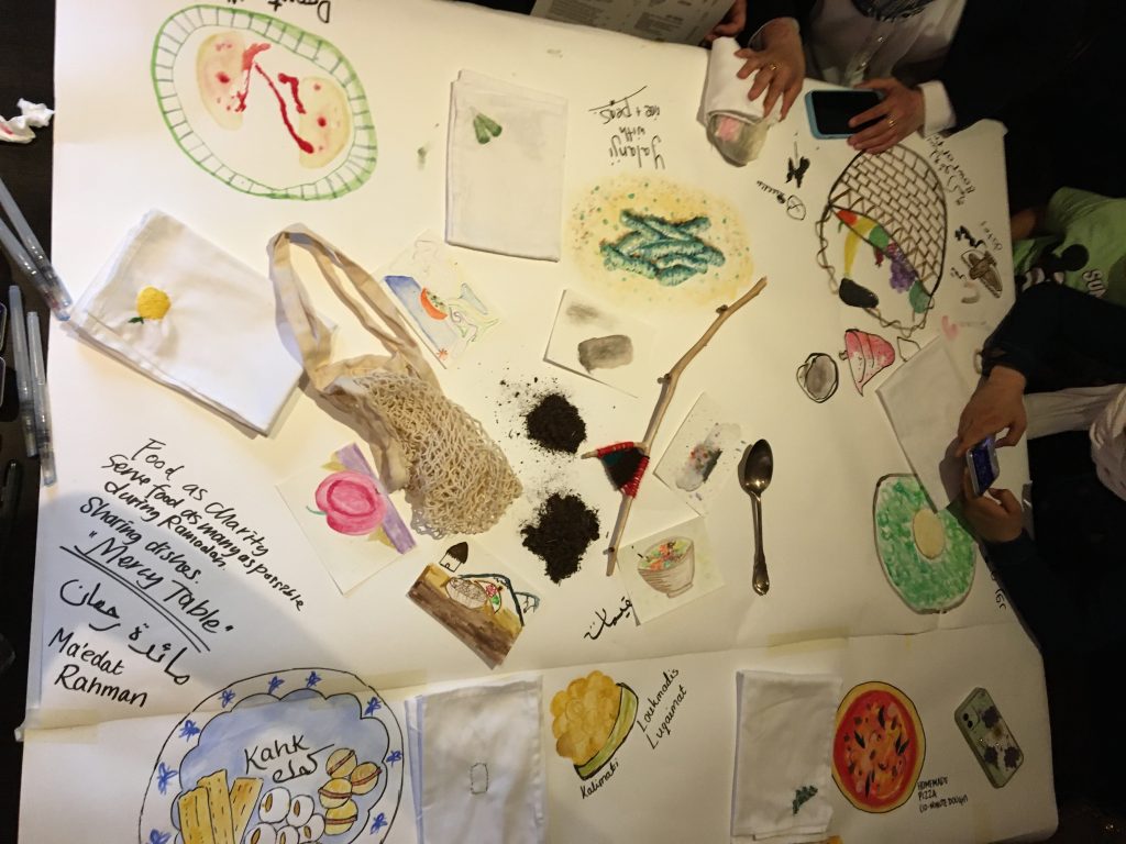 The project sailed off with the Persian New Year celebration 'Nowruz'. In the first workshop, the participants decorated Sholeh Zard, a rice pudding shared with neighbours during this festive season and Ramadan, with the Haft-Mewa, seven dried nuts and fruits, honouring the Afghan tradition, with the addition of rosebuds to bring more joy. Saffron yellow brightness and the irresistible fragrance of cardamom and rosewater teleport your body to Zoroastrian times. We also learned about the Egyptian Spring festival Sham El-Nessim, meaning 'smelling the breeze' and hence a picnic is an essential part. How gorgeous! The following workshops included water colouring of the most celebratory family dish on the postcard painted with edible fragrances, an embroidery session for narrating food-related heritage on the four corners of the napkin, a tea mixing session for knowledge sharing of folk healing and personalised remedies, and finally drawing session for imaginary dinner table, inspired by the generosity of Ramadan culture.